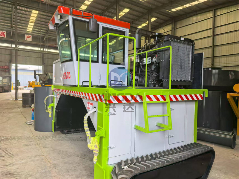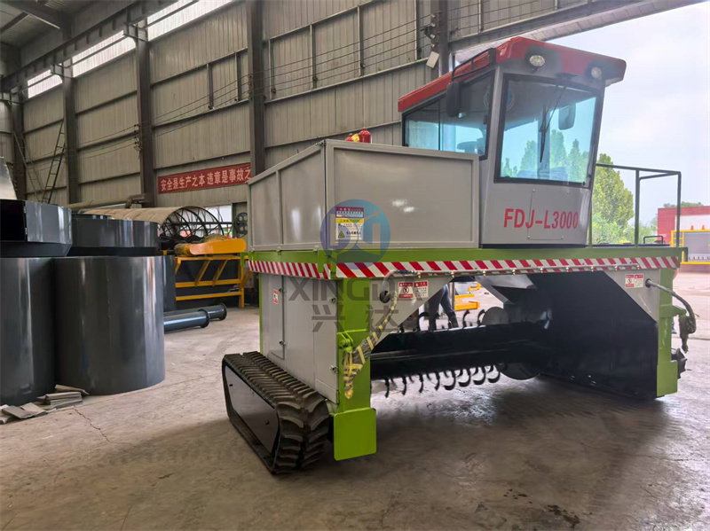 完工现场:3000型有机肥履带翻抛机已经完成制作:履带翻堆机采用履带行走占地少、转弯灵活、可以原地掉头、提高物料堆放场地利用率。机器整体结构合理,整机刚性好、受力平衡、简明、结实、易操控、对场地适用性强,除粗壮的机架,零部件均为标准件,使用维护方便。行驶中整车骑跨在预先堆置的长条形肥基上,由机架下挂装的旋转刀轴对肥基原料实施翻拌、蓬松、移堆,车过之后成新的条形垛堆。在翻抛过程中,物料被高速旋转的滚筒带起并向后移动一定的距离所以在翻抛过程中,翻抛机可对物料打散、粉碎,并带走部分水分。